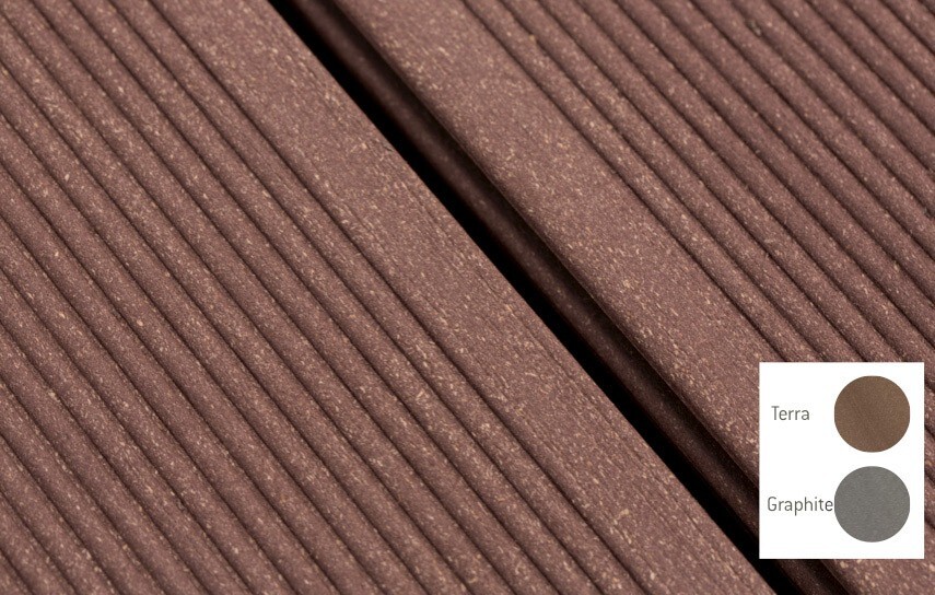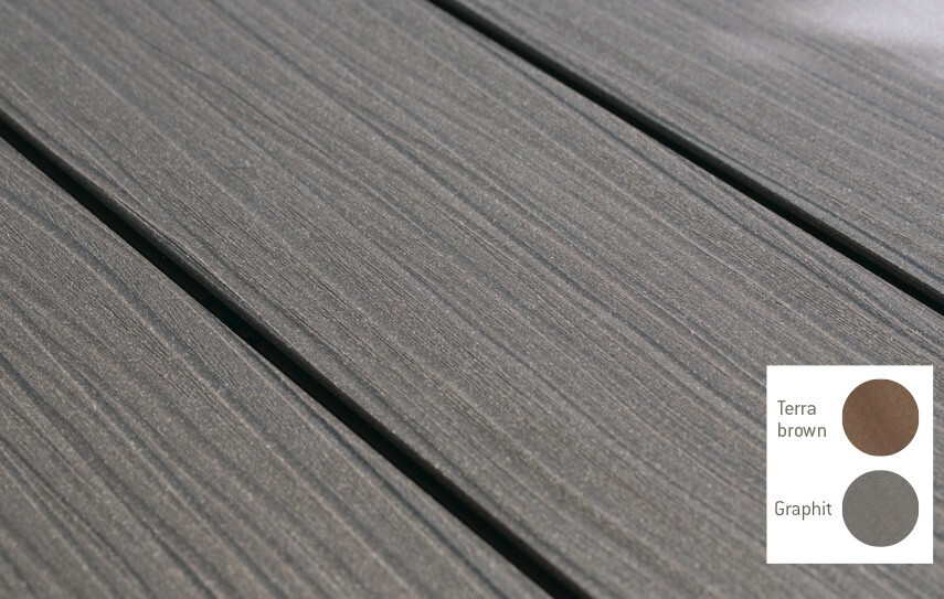 Terasové prkno Trend19 je s tloušťkou 19 mm skutečně silný kus. Má dvě různé strany, na jedné je opatřené jemným rýhováním, na druhé drážkovaným povrchem. Pokládat se mohou obě strany v barvě Terra nebo Graphit. S barevně stálými a neklouzavými prkny, která jsou moderní a bezpečná, skutečně oceníte pobyt venku!